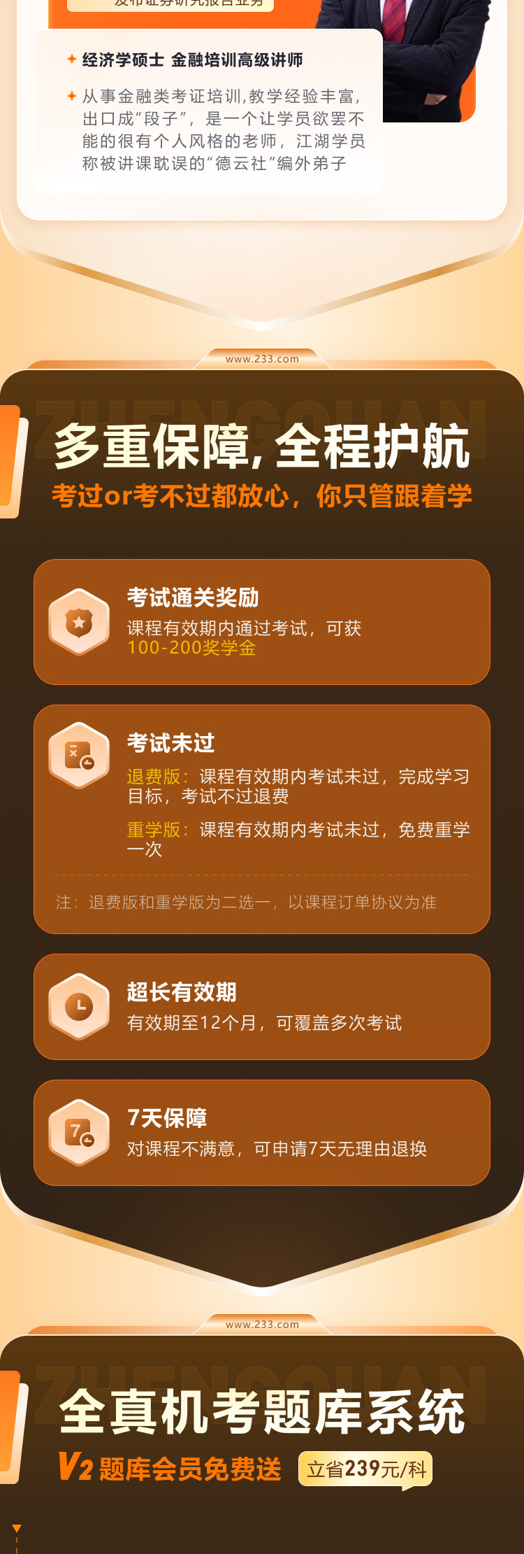 1. 2026年证券从业全科高端班(退费版) 中本考季及后续年份的具体服务项目和细节以乙方官方网站(www.233.com )公布的2026年证券从业全科高端班(退费版) 招生方案为准,每考季可能会根据实际情况调整老师、课程、题库、服务等,乙方有权根据实际调整变更具体服务项目和细节。