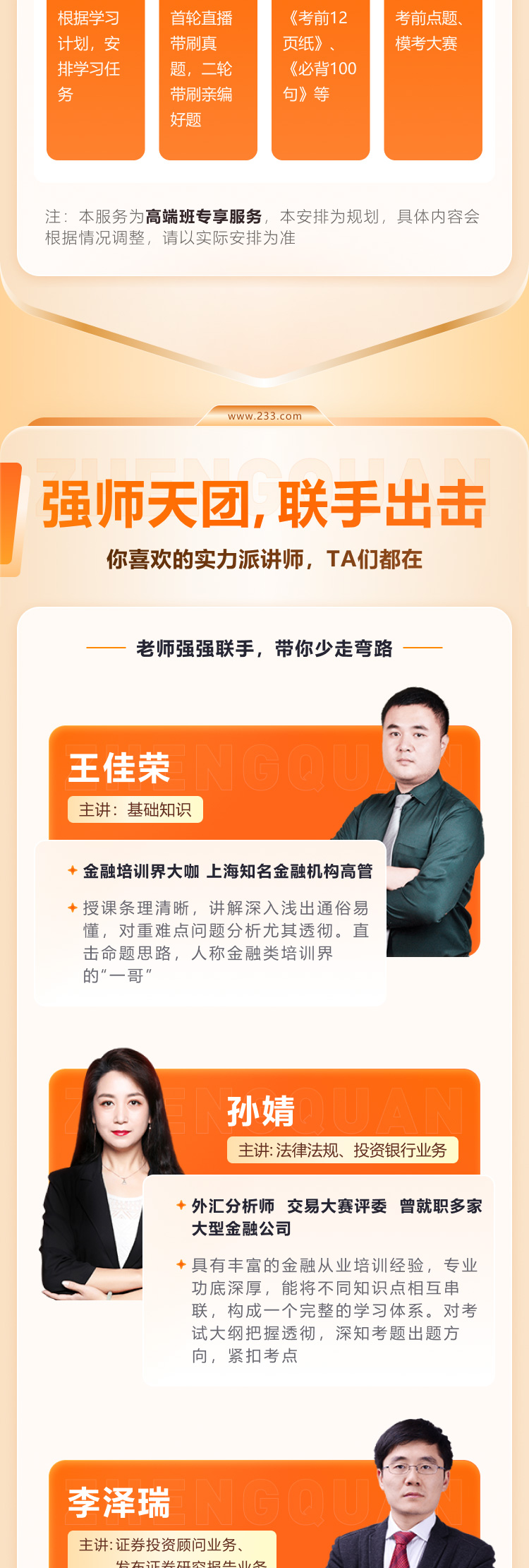 1. 2026年证券从业全科高端班(重学版)中本考季及后续年份的具体服务项目和细节以乙方官方网站(www.233.com )公布的2026年证券从业全科高端班(重学版) 招生方案为准,每考季可能会根据实际情况调整老师、课程、题库、服务等,乙方有权根据实际调整变更具体服务项目和细节。