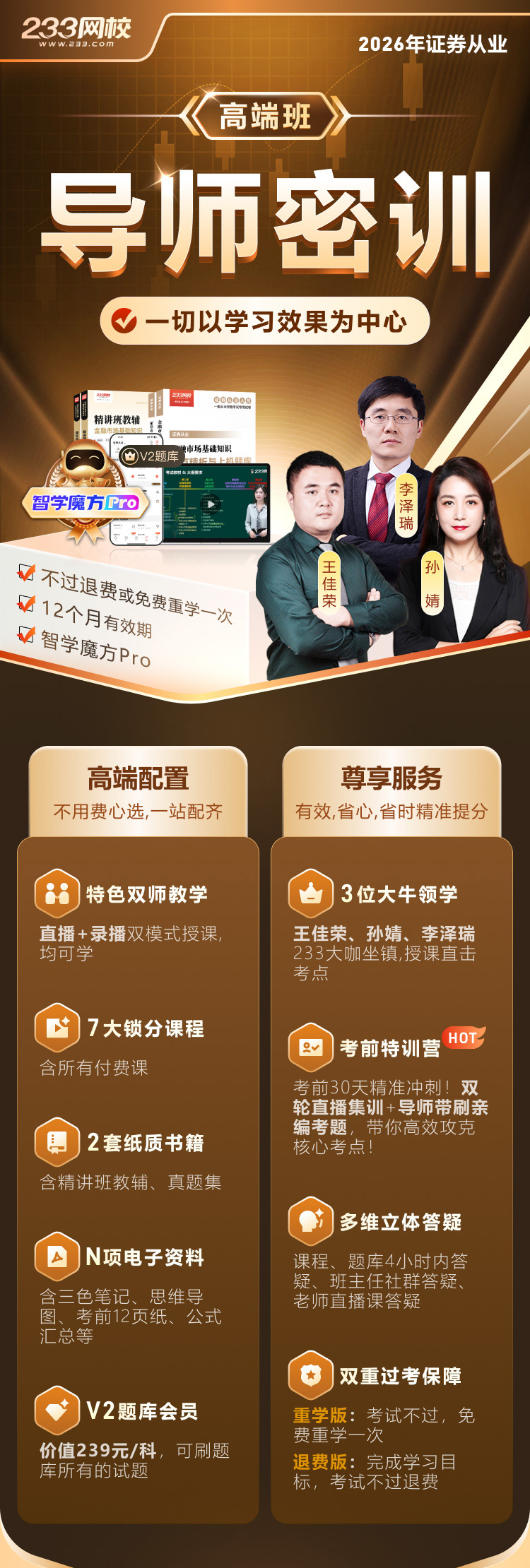 1. 2026年证券从业单科高端班(重学版)中本考季及后续年份的具体服务项目和细节以乙方官方网站(www.233.com )公布的2026年证券从业单科高端班(重学版) 招生方案为准,每考季可能会根据实际情况调整老师、课程、题库、服务等,乙方有权根据实际调整变更具体服务项目和细节。