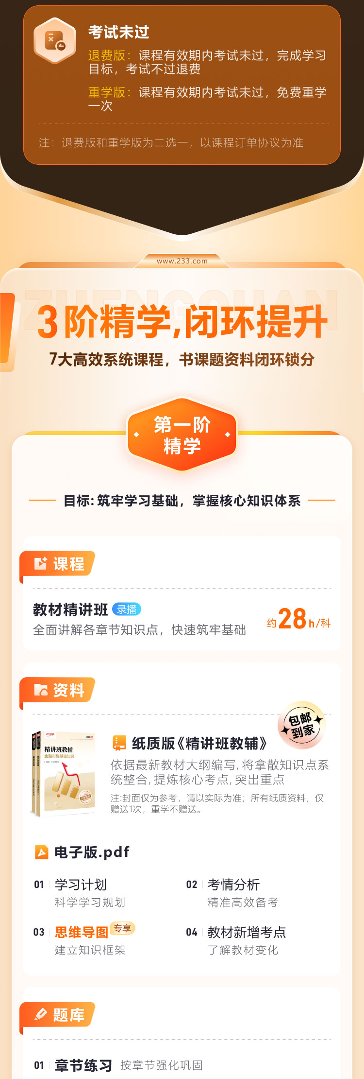 3. 产品特点:在协议约定的期限内,学员如符合协议相关条款规定,将享受考试不过退款的学习保障。