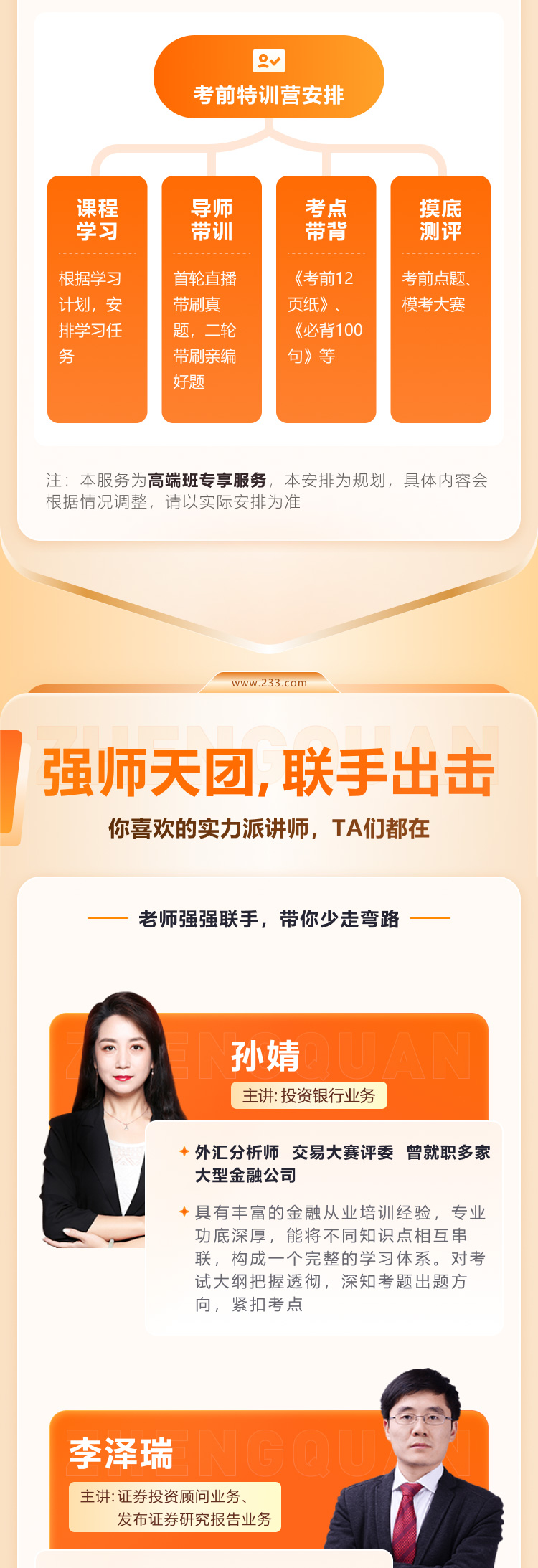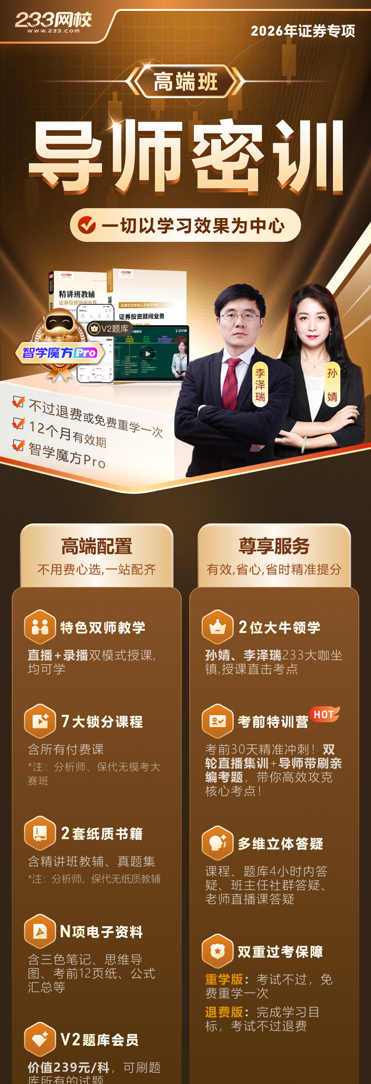 1. 2026年证券专项单科高端班(重学版)中本考季及后续年份的具体服务项目和细节以乙方官方网站(www.233.com )公布的2026年证券专项单科高端班(重学版) 招生方案为准,每考季可能会根据实际情况调整老师、课程、题库、服务等,乙方有权根据实际调整变更具体服务项目和细节。