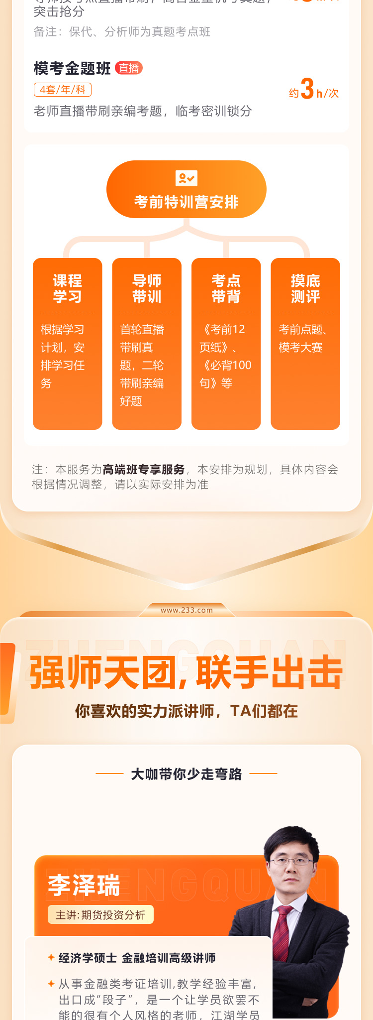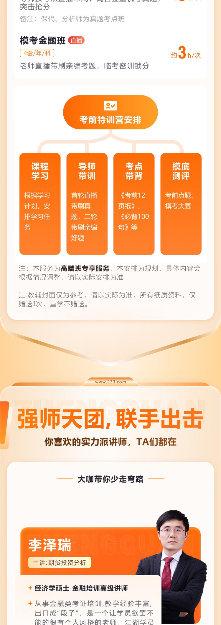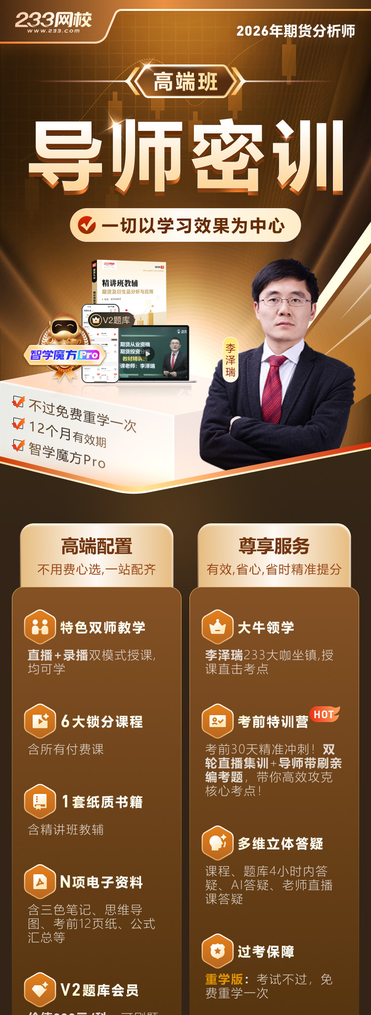 1. 2026年期货投资分析高端班(重学版)中本考季及后续年份的具体服务项目和细节以乙方官方网站(www.233.com )公布的2026年期货投资分析高端班(重学版) 招生方案为准,每考季可能会根据实际情况调整老师、课程、题库、服务等,乙方有权根据实际调整变更具体服务项目和细节。