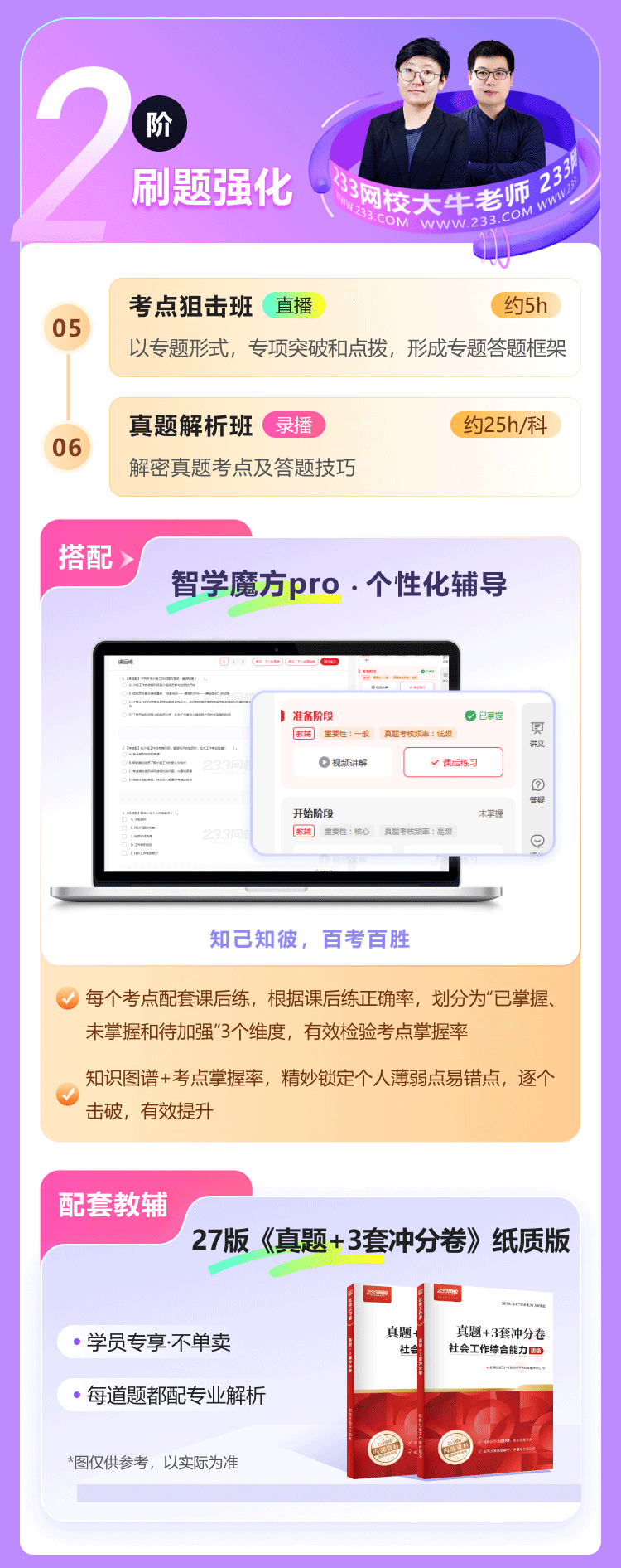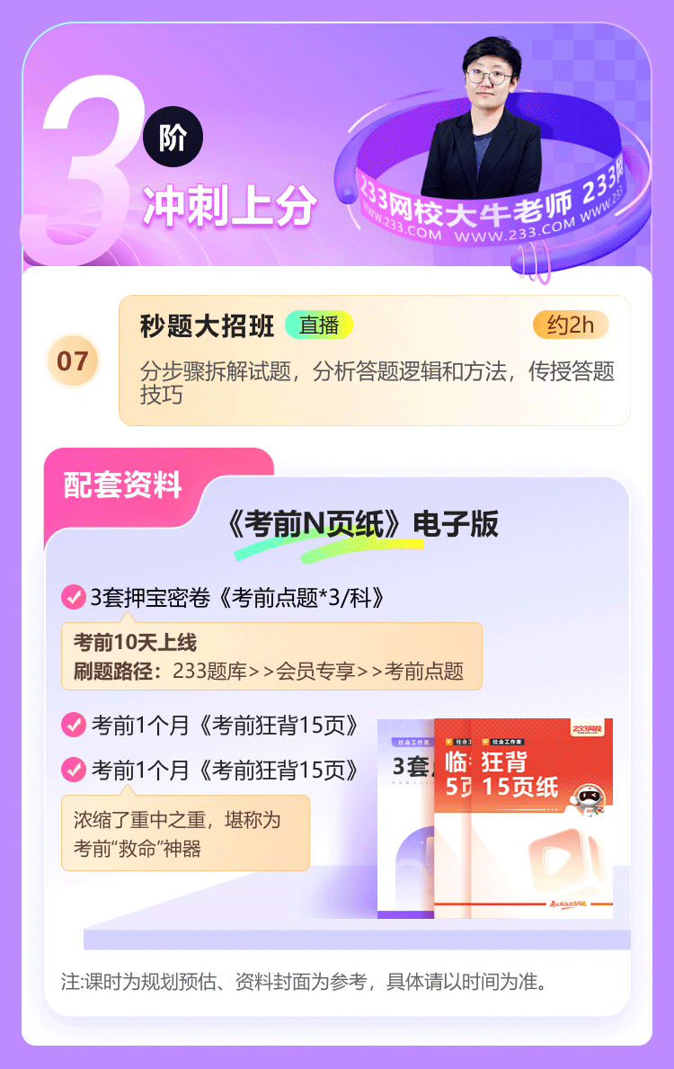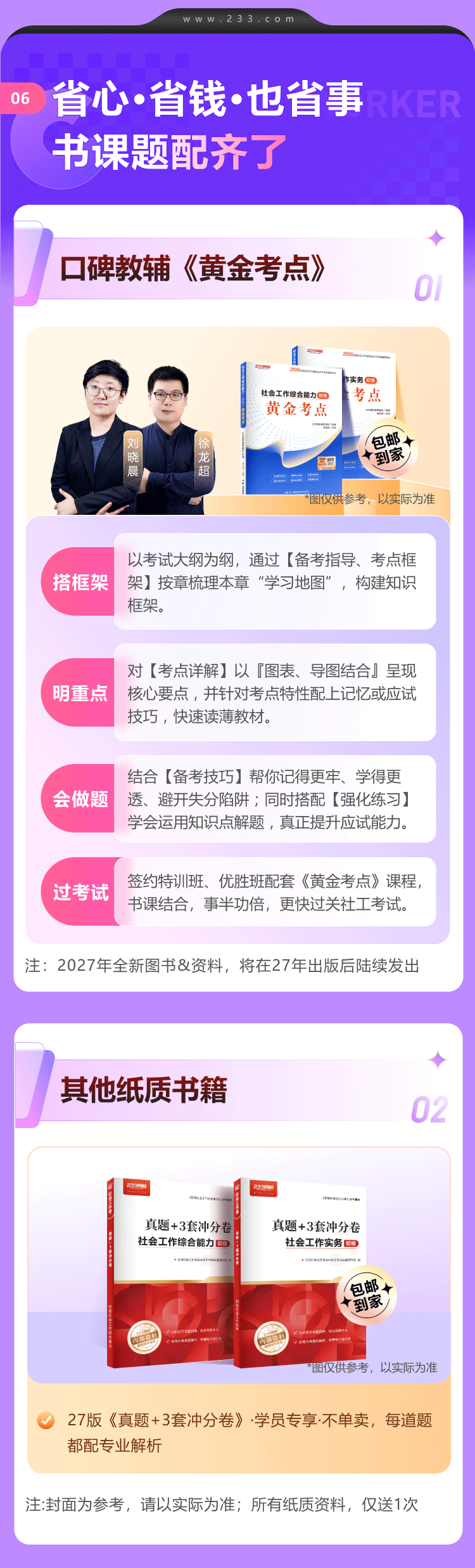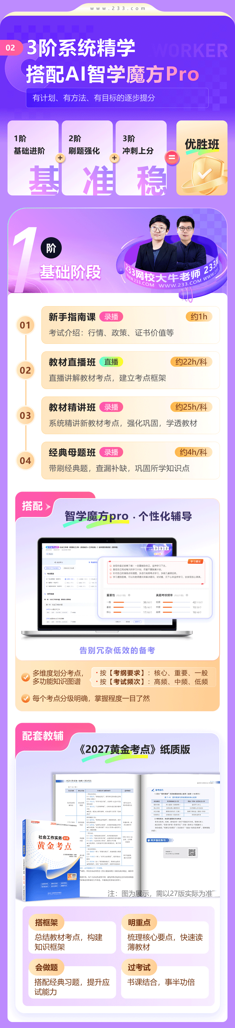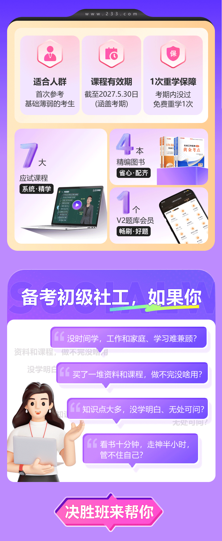 1. 2027年初级社会工作者全科决胜班中本考季及后续年份的具体服务项目和细节以乙方官方网站(www.233.com )公布的2027年初级社会工作者全科决胜班 招生方案为准,每考季可能会根据实际情况调整老师、课程、题库、服务等,乙方有权根据实际调整变更具体服务项目和细节。