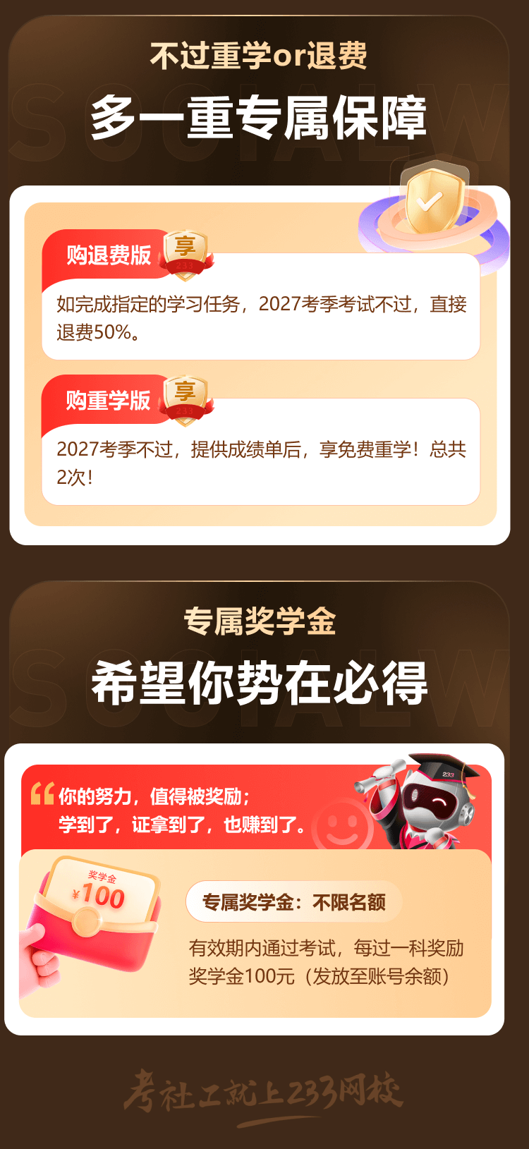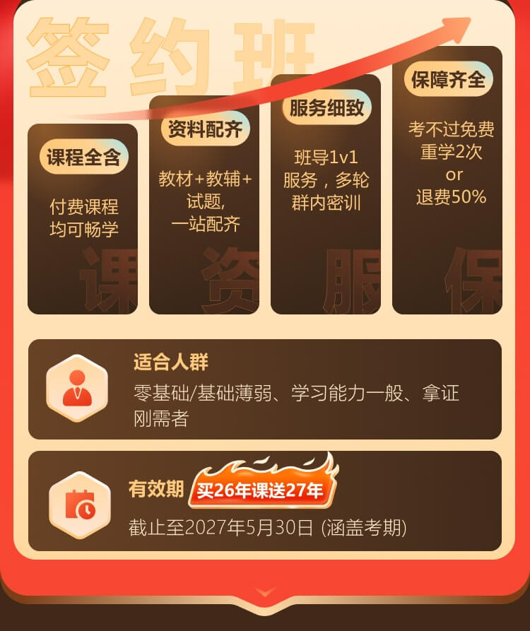 3. 产品特点:在协议约定的期限内,学员如符合协议相关条款规定,将享受报名不成功退费,考试不过退款,2次免费重学的学习保障。(注意:免费重学、考试不过退费服务二选一)