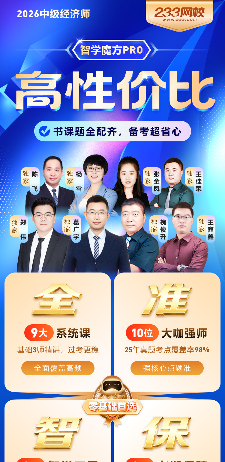 1. 中级经济师全科智学魔方Pro班 中本考季及后续年份的具体服务项目和细节以乙方官方网站(www.233.com )公布的中级经济师全科智学魔方Pro班 招生方案为准,每考季可能会根据实际情况调整老师、课程、题库、服务等,乙方有权根据实际调整变更具体服务项目和细节。